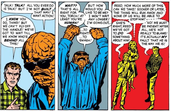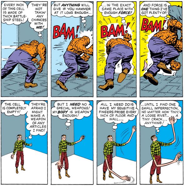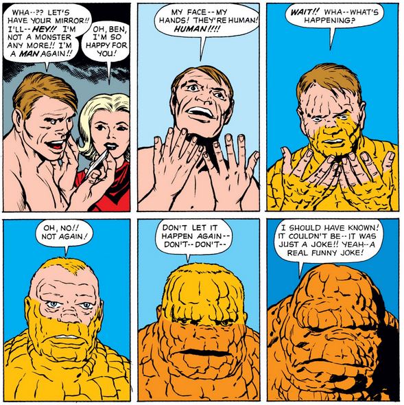 Tragically, in what will become a pattern, Ben thrills to his fleshy form before he soon reverts to the Thing. (Just look at the progression of his despair in the second row.)