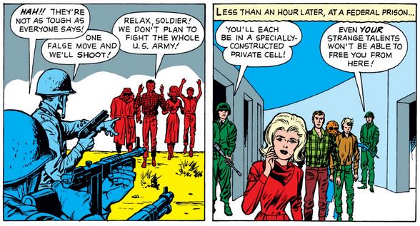Thanks to the Skrulls, the famous Fantastic Four are now infamous, having become “the most dangerous menace we have ever faced” (the “we” presumably meaning humanity). This is an early sign that superheroes are not automatically going to be welcomed and trusted in the Marvel Universe, as opposed to the Distinguished Competition, with the term menace foreshadowing J. Jonah Jameson’s later characterization of the Friendly Neighborhood Spider-Man. (I think the real menace below would be the teenage hothead caressing a rifle and talking about “taking care” of somebody.)