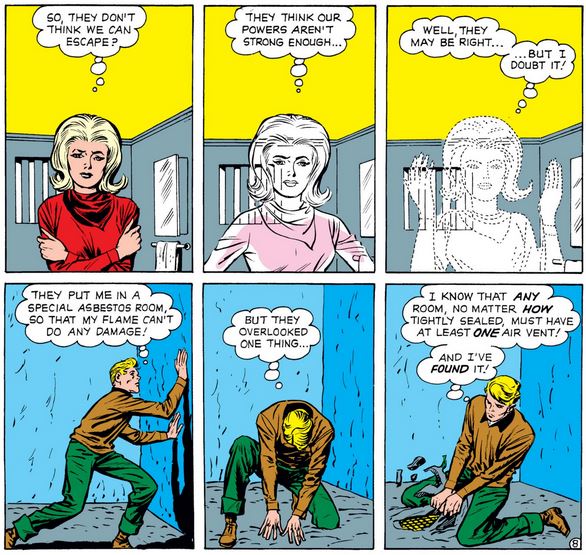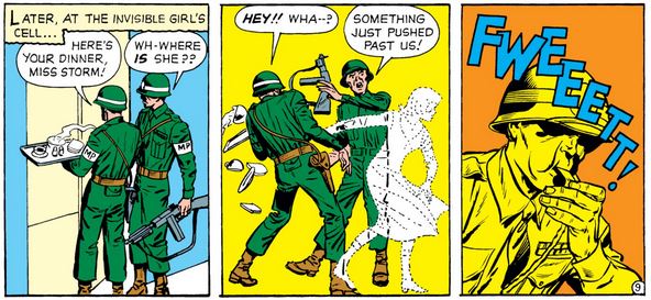 Not aware yet of her forcefield powers, Sue uses her invisibility to simply sneak out when the guards open the door…