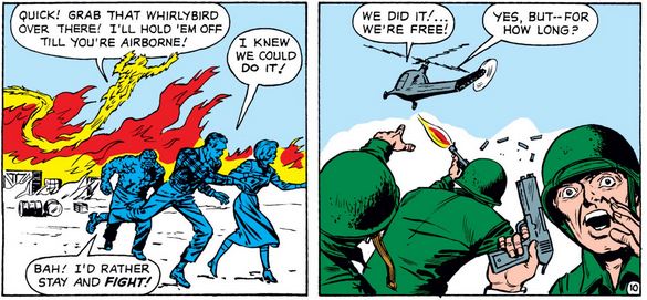 Johnny’s plan works: After carefully attacking an unstaffed part of the launch complex, two of the Skrulls pick Johnny up and take him to Reed’s (main) apartment, where he launches a “4” flare to summon the rest of the group, who FIGHT BACK!