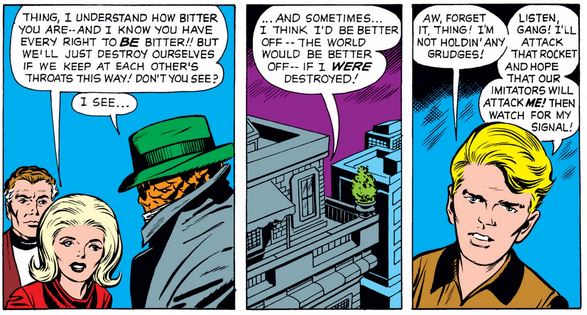 Reed barely has time to play “1930s movie gangster” before Ben loses it again and the others are forced to restrain him, which gives Reed the opportunity to use him as “bad cop” to get the rats to squeal… and tell them again how all would-be world conquerors fear the Fantastic Four. (Note how Sue and Reed both call Ben “Thing”—if they want him to feel better about the state of his life, that might not be the best idea.)