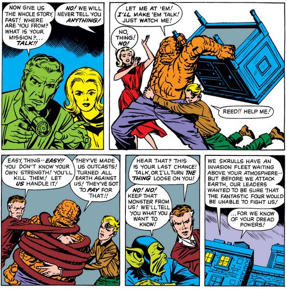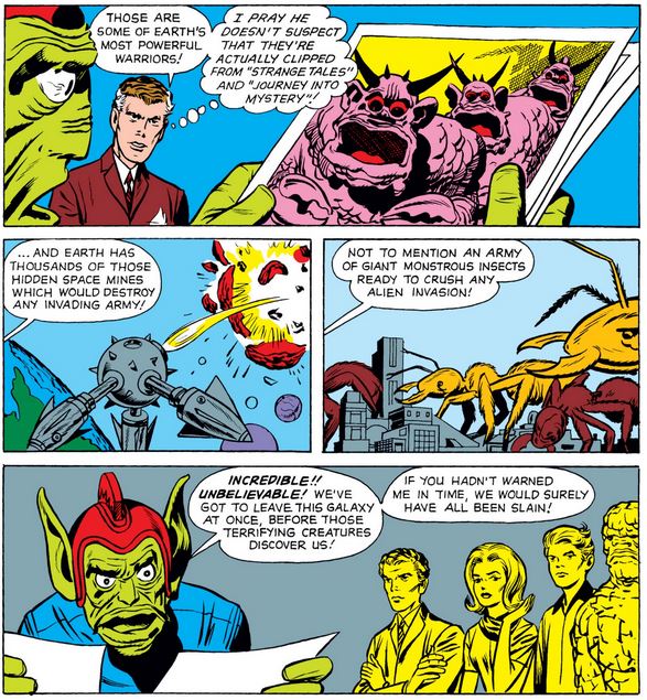 Reed shows them pages from some of the Lee/Kirby monster comics at the time (before they became superhero books after the success of Fantastic Four) and claims they are Earth’s true protectors, whom the Skrulls find even more formidable than the four themselves. (This is but the first mention of Marvel Comics in the Marvel Universe, and more are coming very soon, including a Fantastic Four title chronicling their adventures.)