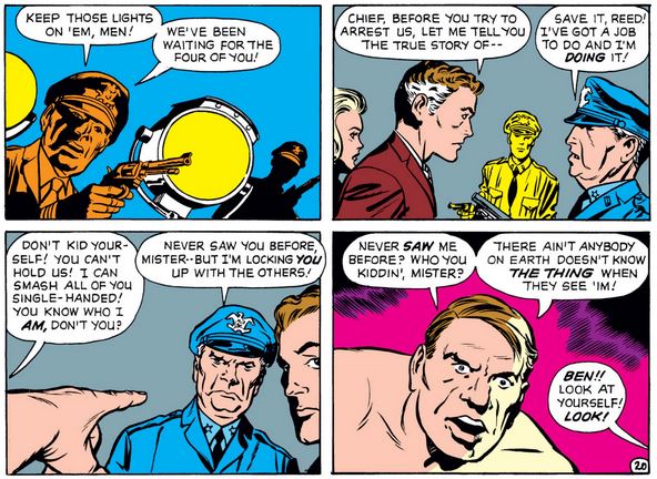 The issue opens with three pages of the individual members of the Fantastic Four using their powers to commit crimes. What’s most interesting about this is that all four are recognized, having apparently become very well known since their first public appearance in the last issue, suggesting that they have had adventures in between the issues (or else a very good publicist).