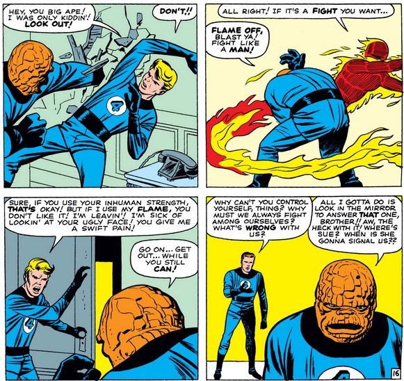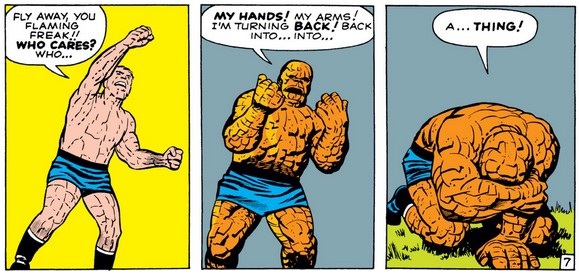 Calling him “Thing” makes some sense here, given that Reed is angry with him, but we’ve seen that they all call him this often, which as I’ve noted before seems cruel in light of his uniquely extreme transformation. (The full extent of his self-loathing, discussed in chapter 5 of my book, is yet to come, but this can’t be helping.)