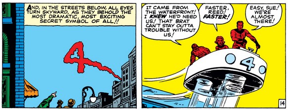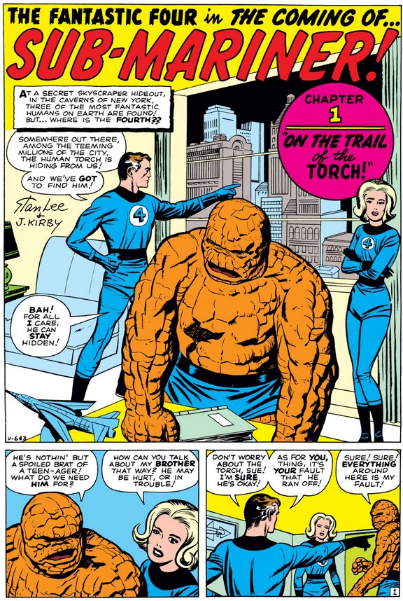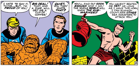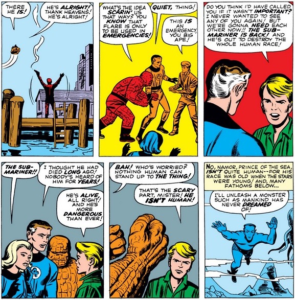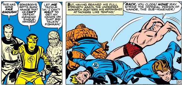 Ben’s heroism seems to have softened Johnny towards him a bit (although the gravity of the situation may have helped too), and Ben dismisses his praise with a joke (as will become typical of him, just like with “accusation” of heroism). And Reed finally gets a glimpse of Namor, who was commanding Giganto from underwater the entire time.