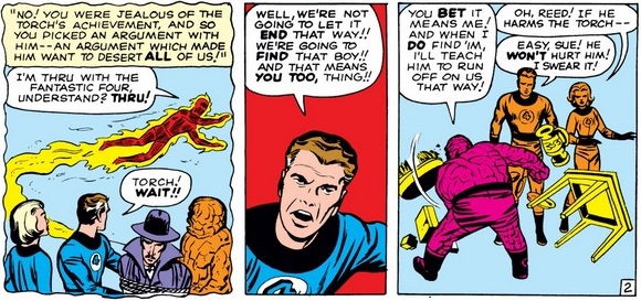Ben tries to deflect the blame through exaggeration, but Reed is determined and precise, fingering (sorry) Ben’s jealousy at Johnny saving the day. Ben is not calmed, but it is hard to tell if he disagrees with Reed or knows all too well that he’s right. (Likely both.)