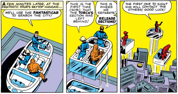Again, we see a cool feature of the Fantasticar shown almost in passing. It strikes me as odd that Ben is assigned to a section to one side rather than in the back, but I suppose Reed would have to adjust his flying to even out the weight in any case. (Any pilots out there care to chime in? Might it be easier to control for pitch than roll?)