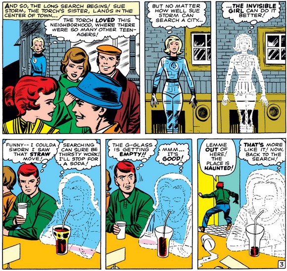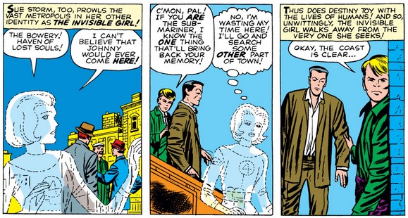 As each starts the search for Johnny, Sue remembers that the cool kids all hang out in “the center of town” (Washington Square Park? Union Square? Times Square?), a neighborhood that Johnny “loved.” (Yikes—even Ben ain’t that grim.) After searching for what must have been minutes, she takes a break for a soda and a chance to freak out the locals (as she did in the opening pages of the first issue).
