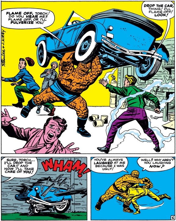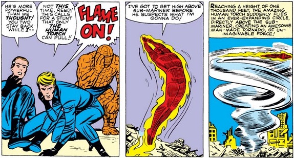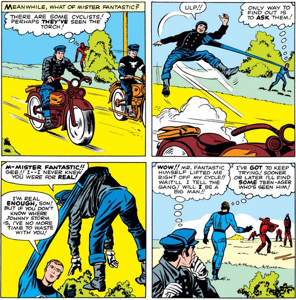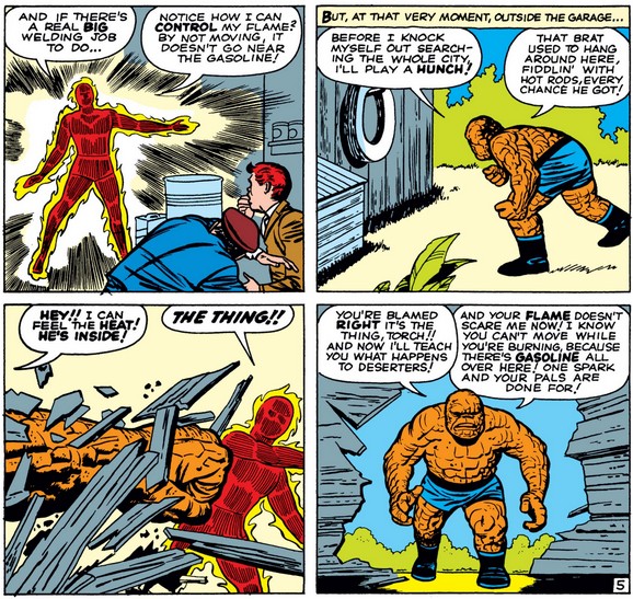 I think his next feat is a bit reckless, regardless of how experienced he is with his flame by the fourth issue. (What’s more, I don’t think lighting your entire body on fire is going to be very useful for any welding jobs, kid.) Fortunately, in this case, we don’t find out what Johnny would do next, because Ben finds him easily, suggesting he knows Johnny better than either Sue or Reed (and he didn’t stop for a soda on the way), and he is reasonably skeptical of Johnny’s ability to control his flame around gasoline.