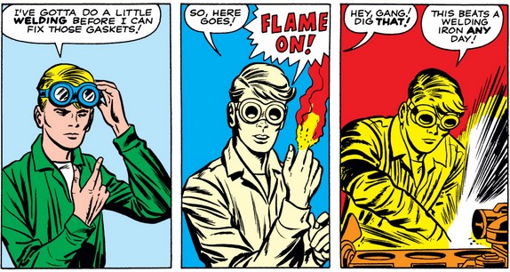 Unfortunately we don’t get to see his hijinks on the baseball diamond, because the scene shifts to Johnny himself, who’s fooling around with a car in a nearby garage with his chums and showing off the precision of his flame—as well as uttering his famous catchphrase for the first time (and in red block letters, no less).