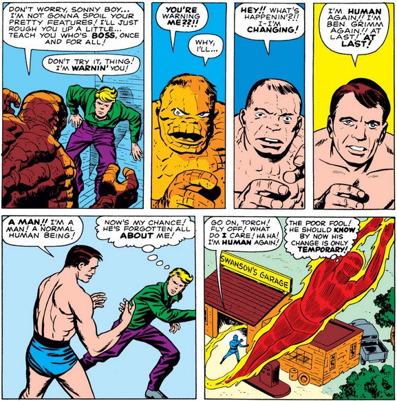 After he promises not to mess up Johnny’s face, though, Ben experiences his second random transformation (after issue #2), which makes him forget all about Johnny (which is fair, I think) and lets Johnny get away (to silently express either pity or snark).