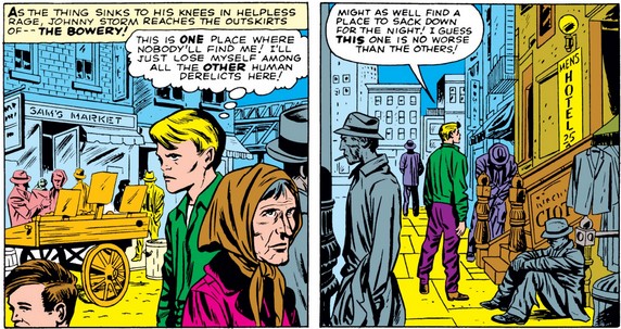 Insensitive as Johnny sounds in the first panel above, note that he says “the other human derelicts,” suggesting some self-pity on his part as well.