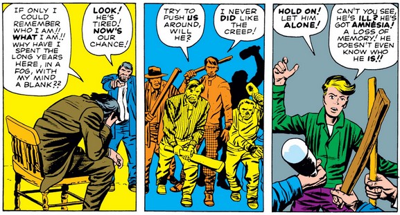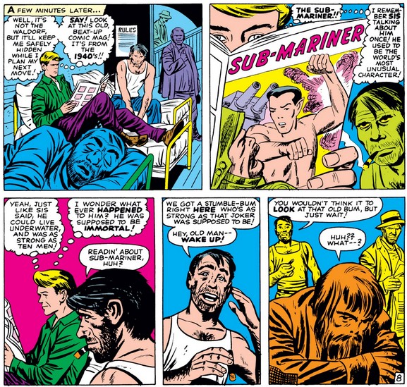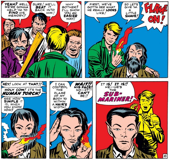 Pretending the other men care as much as he does about stranger’s identity, Johnny shows what else his welding finger can do—and uses his catchphrase again—before discovering the old bum looks just like how his creator and regular Golden Age artist Bill Everett drew him (assuming that’s all Johnny had to go by when he recognized him).