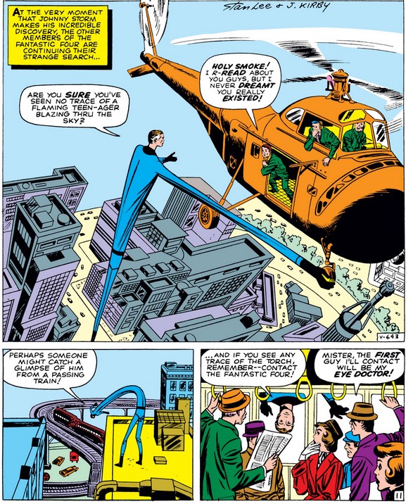 We’ll have to assume Johnny closes his mouth eventually, as our focus returns to Reed, apparently stretching hundred of feet into the sky to ask helicopter passengers if they’ve seen a “flaming teen-ager” in the sky. (This is more reasonable than interrogating random bikers or, as he also does below, train passengers—surely not while the train is moving, though?) I trust he’s holding onto the wheel to steady himself rather than the copter, but how can they possibly hear each other over the rotor noise?
