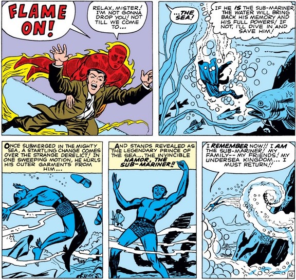 Johnny says “Flame on!” for the third time this issue—he must think an angel gets its wings every time he says it—before helping Namor regain his strength and memories by dumping him in the drink…