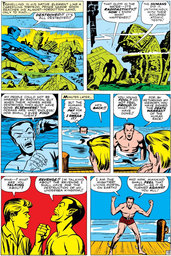 …which, while generous and selfless, nonetheless backfires as Namor finds his people missing, reigniting the hatred of humanity that led to him fight the original Human Torch in 1940’s Marvel Mystery Comics #8, the very first superhero “crossover” (several months before the Justice Society of America formed in All-Star Comics #3).