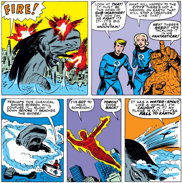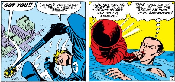 Oh, and that monster Namor mentioned? It’s Giganto, whom Namor controls with a “trumpet-horn” (although I usually just say trumpet), later identified as the Horn of Proteus. The army’s large artillery are useless against Giganto, as are Reed and Johnny…