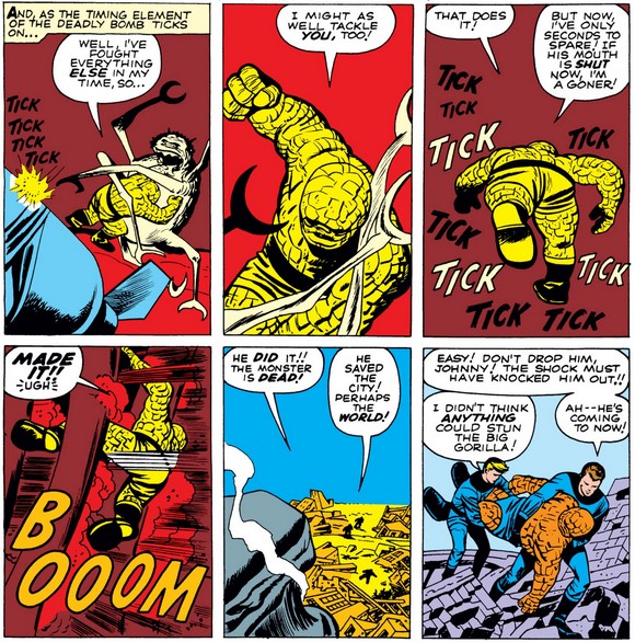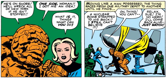 Ben saying “One side, woman” (groan) and “I got me an idea” (which sounds more authentic than “bah!”) in the same speech bubble gives me a headache, but he demonstrates his heroism by preparing to deliver a massive nuclear bomb into Giganto’s gullet (like Jonah, whom he references later). He claims not to be a hero, as he often does in future stories, but in this case it seems more like obstinacy than humility. (And there’s Sue, calling him “Thing” again…)