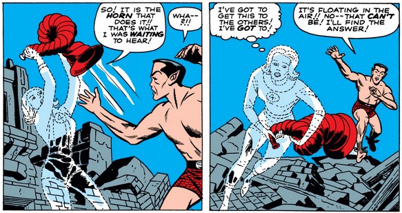 Namor says too much and yoink, the horn is gone. While Sue can make her clothes invisible, she apparently doesn’t realize she can do the same with the horn…
