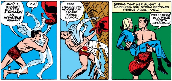 Namor sees Reed’s bluster and raises, retracting his offer and instead threatening both the surface world and Sue’s freedom. She offers to sacrifice herself to save the rest of humanity, but Namor is offended she considers it a sacrifice at all—and given the attraction she shows for him soon, she might not have been entirely sincere about the nature of this “sacrifice” anyway.