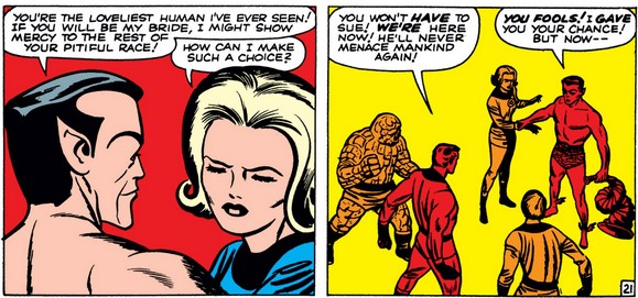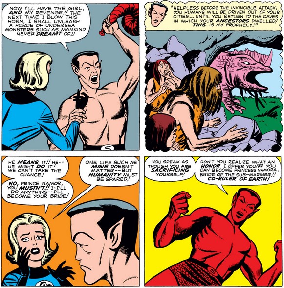 Namor shows how deep his newly rediscovered hatred of the human race runs when he offers to set it all aside if this women he literally just met marries him. Sue seems too ready to consider it, but Reed lets her off the hook by pledging to continue defending the world against Namor.
