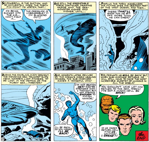 Once again, it falls to Johnny to save the day, creating an air vortex strong enough to lift both Namor and whatever was left of Giganto and dump them back in the ocean, where the Horn of Proteus is “lost forever” (it isn’t) and Namor swears to return (he will).