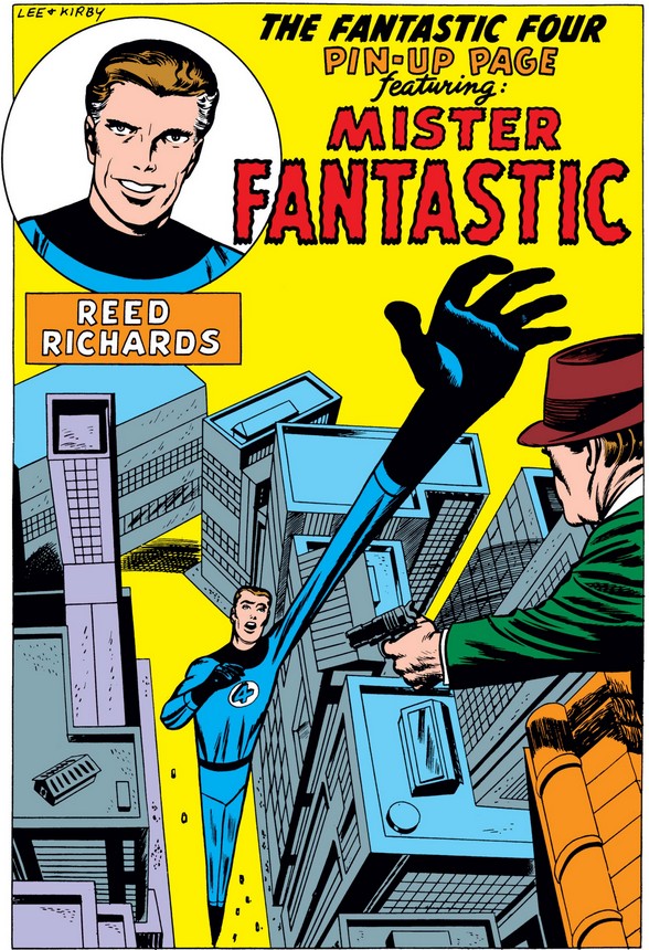 As the last two issues did, this one ends with a portrait, this time of Reed. demonstrating his vertical reach (also seen in the story) but prompting the reader to wonder what would happen if the gunman shot him. (We saw him dodging bullets in the last issue, but have yet to see him let them hit him and stretch his elastic form.)